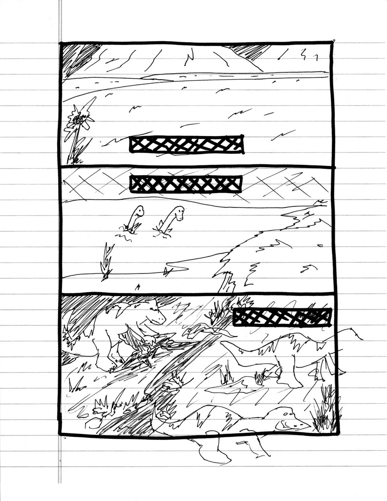 Once I’ve got the page layout down in a way I like, I give it to Brian, and he disappears for a while. When I see him, he will tell me things like “Dude, I’ve got this really great Pterodactyl framing these mountains in panel one!” I have no idea what he’s talking about because panel one is supposed to be flowers in a field, but it sounds awesome.