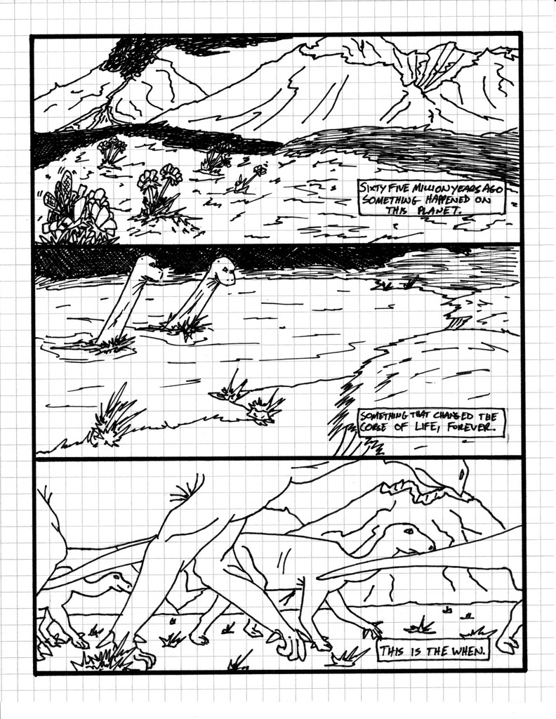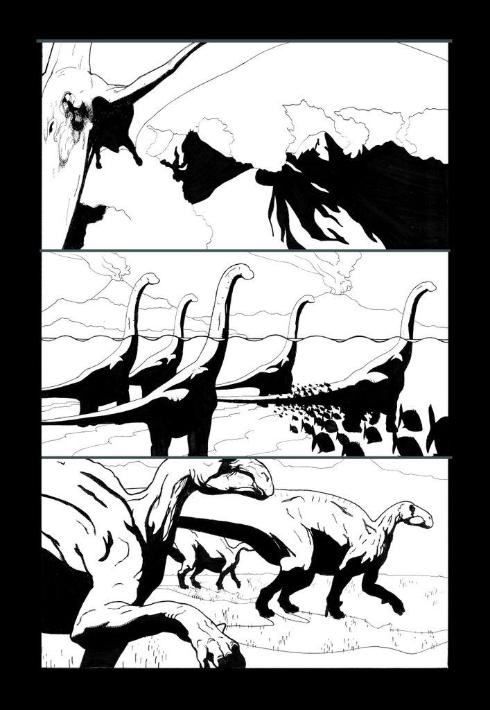 I have always been a fan of large horizontal panels. They feel like a movie to me and I really like the framing they create, especially for landscapes. For this page, as it really begins our comic’s story, I wanted to showcase some of our landscapes and some of our dinosaurs.